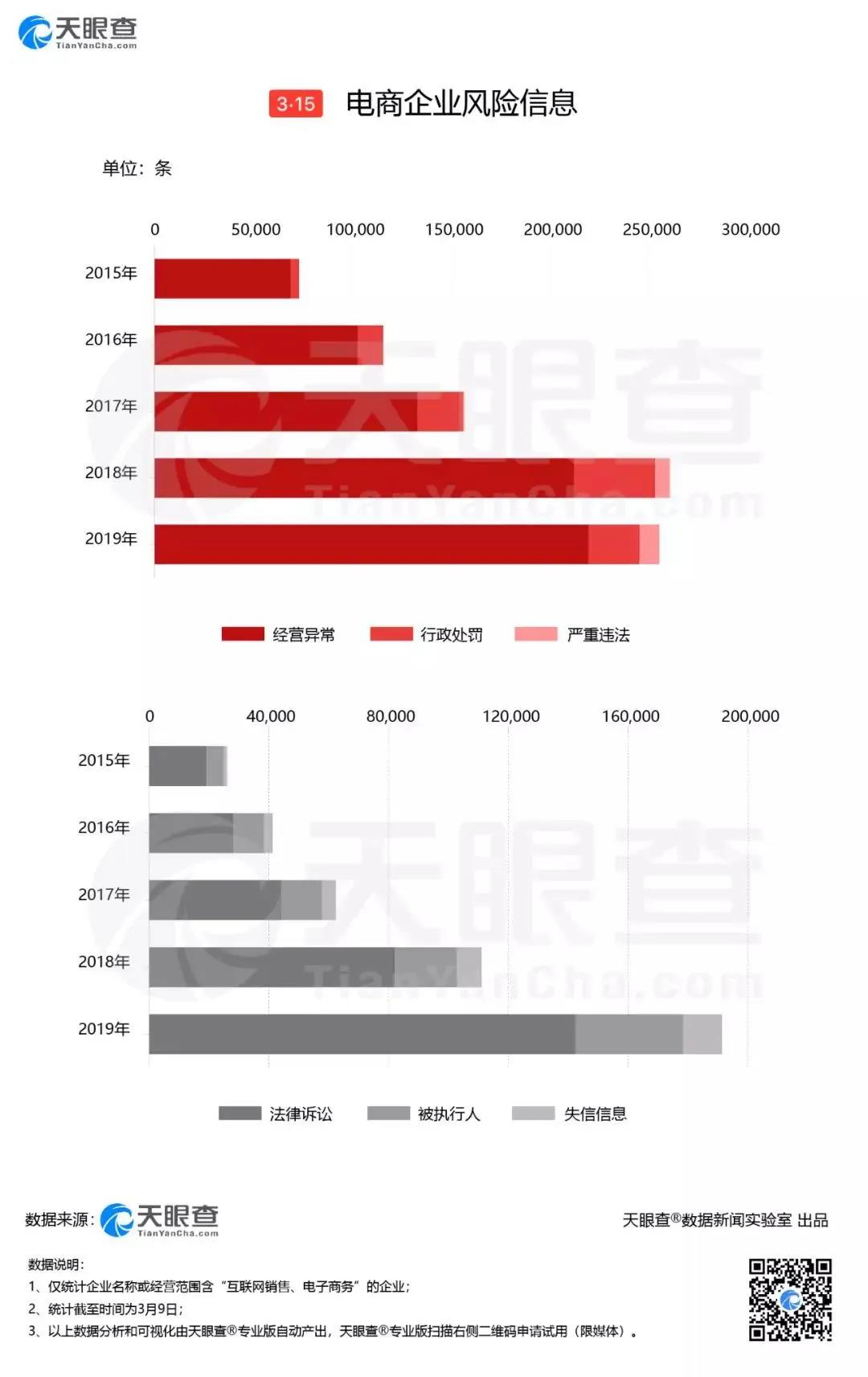 從司法風(fēng)險來看,法律訴訟案件數(shù)量持續(xù)上漲,僅2019年就達(dá)14萬件。此外,電商企業(yè)近5年共產(chǎn)生8.6萬條被執(zhí)行人信息和超3萬條失信信息。