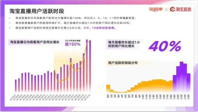 《報告》顯示,淘寶直播的日均觀看用戶數(shù)同比大幅增長超150%,環(huán)比在3、6、10、11月份增幅最明顯;淘寶直播重度用戶的規(guī)模持續(xù)擴大,每天觀看時長超過1小時的用戶同比增長達到40%。