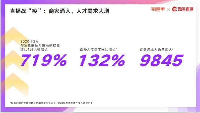 智聯(lián)招聘聯(lián)合淘榜單發(fā)布的《2020年春季直播產業(yè)人才報告》顯示,2020年2月淘寶直播新開播商家數(shù)量環(huán)比1月大幅增長,達到719%;直播人才需求同比增長132%,直播領域人均月薪達9845元。