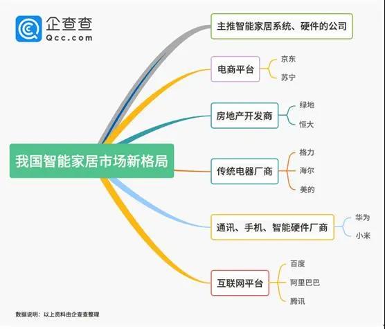 不過,目前中國智能家居市場(chǎng)正在形成新的格局,企查查整理了部分涉足智能家居的品牌,大致分布在這六大陣營:主推智能家居概念的智能家居系統(tǒng)和智能家居硬件初創(chuàng)公司陣營;以格力、海爾、美的等為代表的傳統(tǒng)電器廠商陣營;以華為、小米等為代表的通訊、手機(jī)、智能硬件廠商陣營;以BAT為代表的互聯(lián)網(wǎng)平臺(tái)陣營;以京東、蘇寧等為代表的電商平臺(tái);以綠地、恒大為代表的房地產(chǎn)開發(fā)商。
